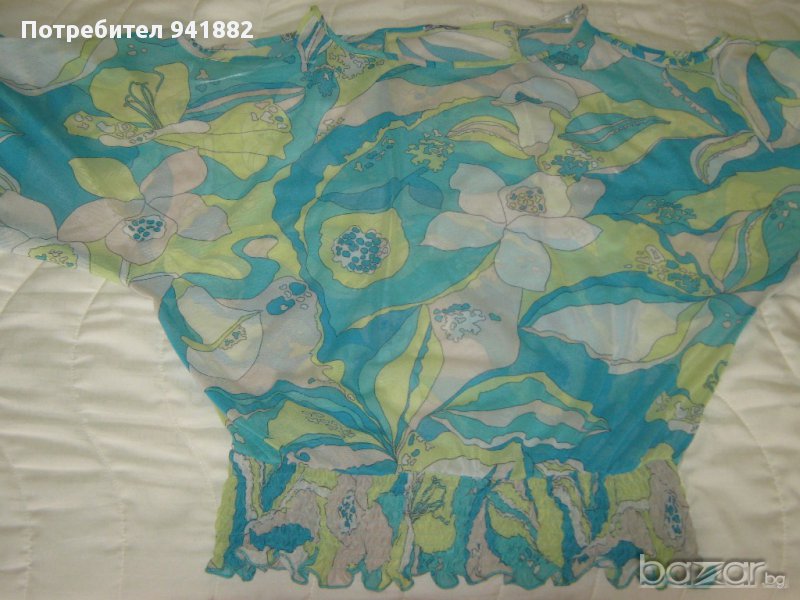 В отлично състояние.100% полиестер(материята наподобява тюл). Ширина долу - от 39 до 54см.(на ластик е), дължина - 55см. Ръкавите са срязани в горната част, а дължината им е 7/8.