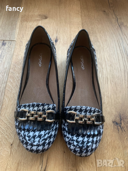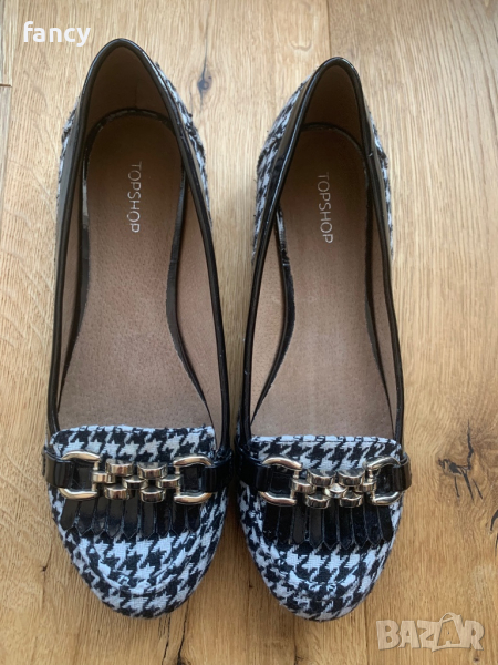 Удобни и стилни мокасини Topshop. Номер на стелката 38, но са умалени и отговарят на 37 или 37.5. Дължина на стелката 24см. Малък ток с височина 2см. Обувани са веднъж за не повече от час, колкото да разбера, че са умалени и няма как да ги нося. Неразличими от нови.