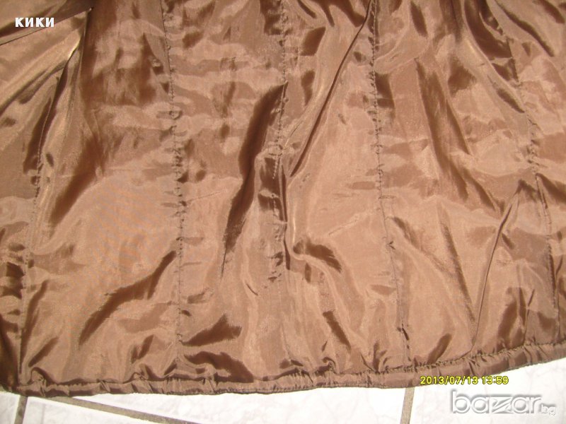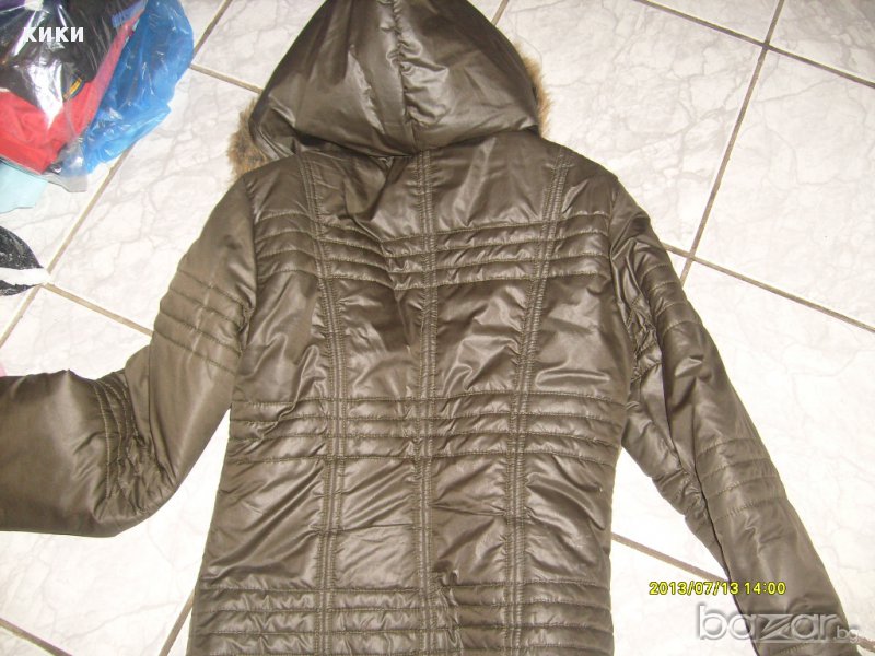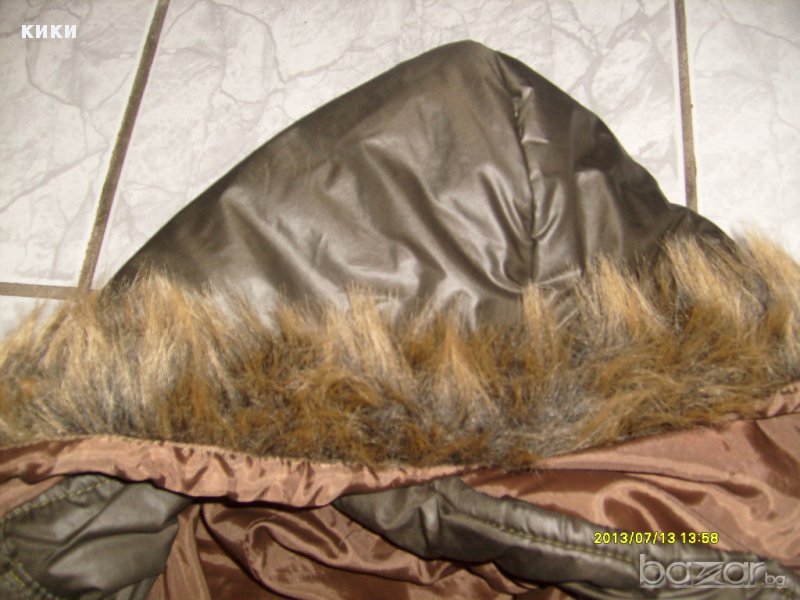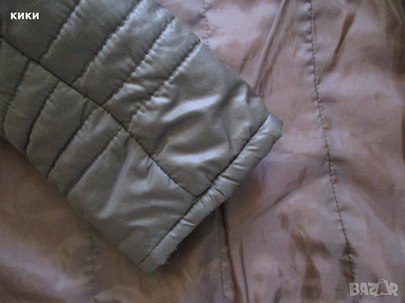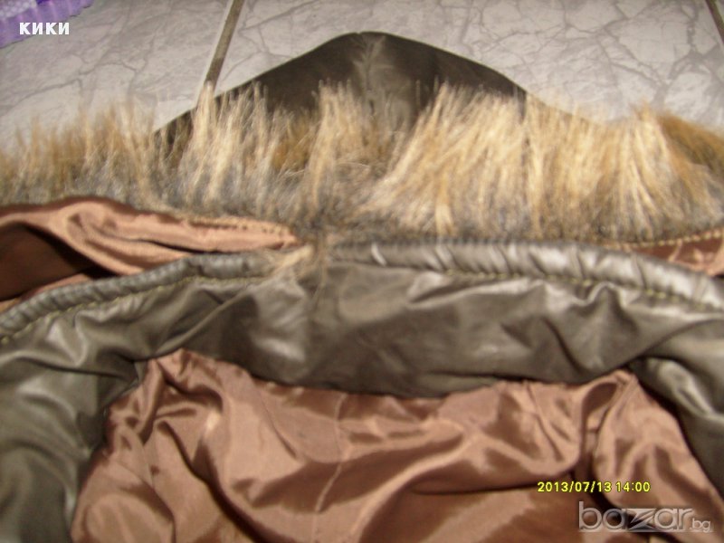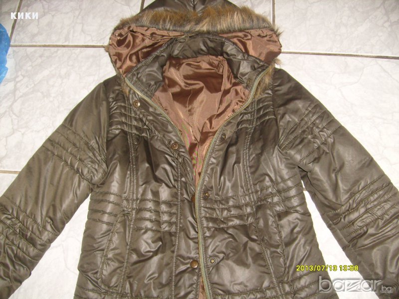 Цвят Каки. Мек шушляк . Много топли и е леко. Качулката се маха /копчета тик-так/ Закопчава се с метален цип и копчета тик -так- Леко вталено. Рамете 38-39 см подмишници -45 см ръкав-60 см талия 40 см Дължина на якето- 54 см.