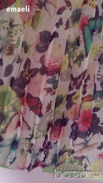 Нова рокля без етикет на Н&М за 3-4 г. Плисирана, 3 цветя като брошки, десен на красиви цветя и пеперуди, закопчава се на гърба. Не разменям!При интерес се свържете с мен на посочения телефон или оставете съобщение. Ще Ви отговоря възможно най-скоро. Изпращам по Еконт след оферта и подадени данни за пратката на л.с. Моля, вижте и другите ми обяви.
