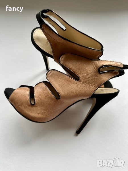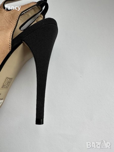 Страхотни летни сандали Topshop! Произведени в Бразилия. 100% естествена кожа в телесен цвят. Висок черен ток, облечен в плат. Дължина на стелката - 25,7см Височина на тока - 12см Оригинална цена - 99 EUR На етикета пише 40 номер, но бразилските обувки са умалени и реално отговарят на 39 номер.