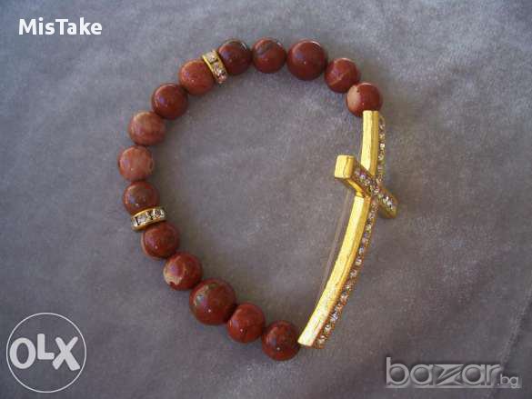 Нежна гривна от Яспис с кръст. Ясписът е камък на Скорпион, Риби и Дева. Символизира силата и волята. Силен амулет. Предлага се в красива опаковка, подходяща за подарък.