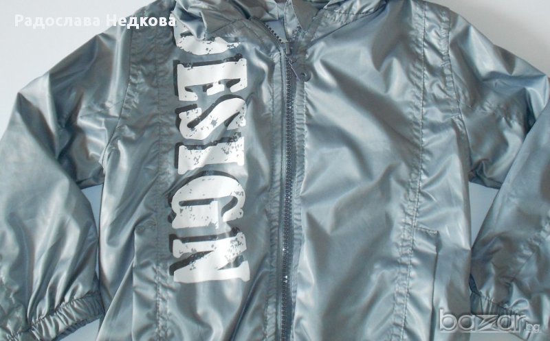 Страхотно пролетно яке за момче в сив цвят с качулка и надпис. Предпазва от вятър с памучна подплата. Внос от Турция! Налични размери - 110 и 116 см.