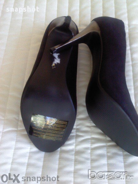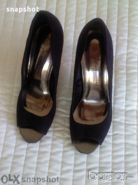 Нови елегантни обувки с отворени пръсти и тъмен сребрист ток. От черен велур. Тъй като няма етикет с материалите, мисля, че е качествен еко велур, който е неразличим от естествен велур. Омекотена стелка с дължина 25.5 см и ток 10 см. Качествена изработка, английска марка. Изпращам с преглед и тест по Еконт с отстъпка, като доставката е за ваша сметка. Разбира се, можете да върнете стоката след прегледа, като заплатите обратната доставка. Поемам разходите за връщане при условие, че има някакъв дефект, който не съм видяла. Благодаря!