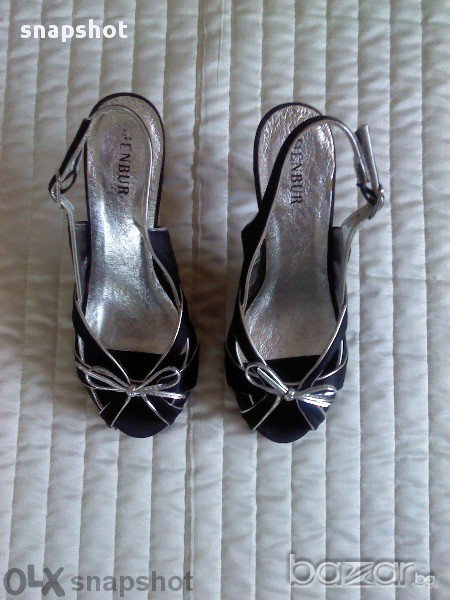 Луксозни нови официални обувки MENBUR от черен сатен отвън и сребриста естествена кожа отвътре. Много елегантни и удобни. Дължина на стелката 23.5 см. Малка платформа с височина 1.5 см и височина на тока 10 см. Продажна цена 200 лева. Давам ги за 50 лв. Линк към сайта на фирмата https://www.menbur.com/bg/en/eveningsum-en?color=3,3&price=0