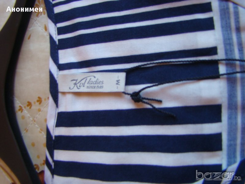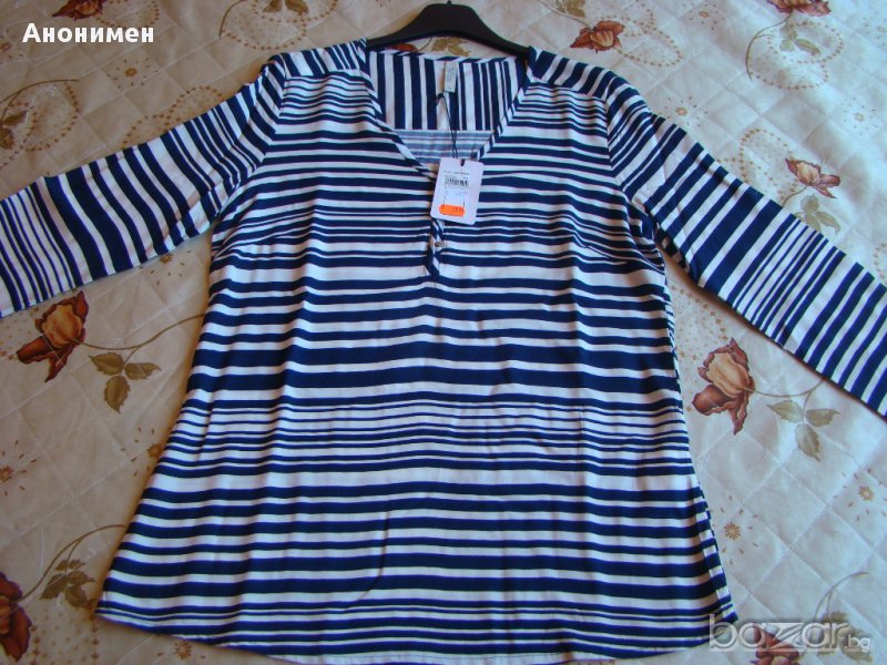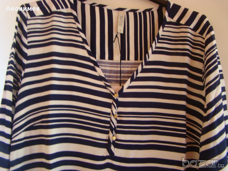 Нова дамска туника / блуза на KENVELO. Страхотна материя, лека, ефирна, много подходяща за топлите дни. Актуална морска разцветка - бели и сини райета. Купих я на намаление за 30 лв., но не прецених размера. Отговаря си на размер М, но аз съм с малък бюст и не ми стои добре.