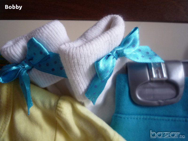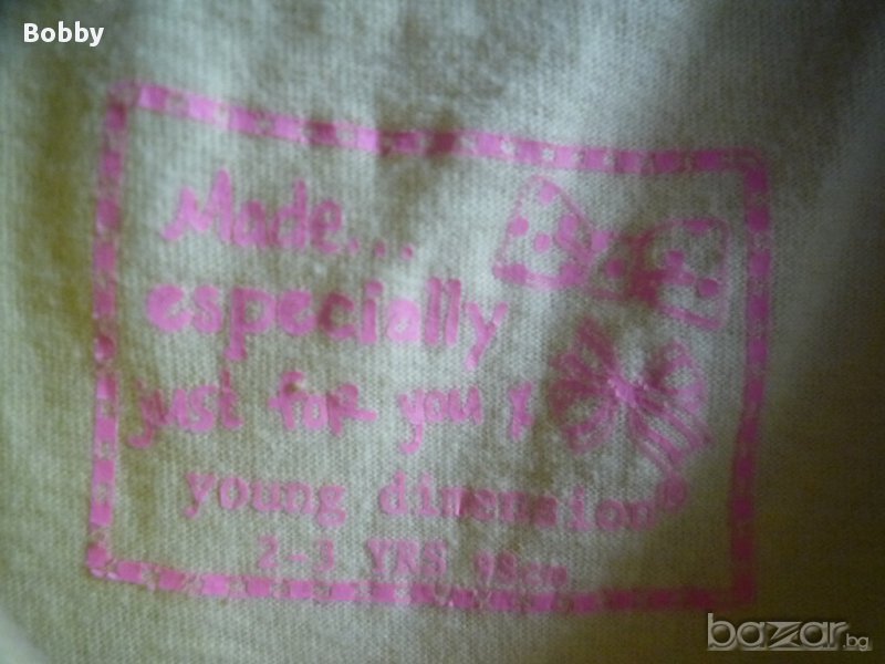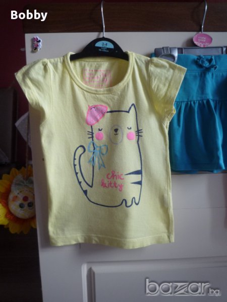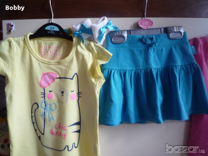 Сет от две тениски, поличка и чорапки 2-3 години. Дрешките са в много добро състояние. Розовата тениска е на George - има топченца, които съм снимала, но иначе е много сладка и супер мека. Поличката е на Place и има панталонки отдолу за удобство на детето. По етикет поличката е за 4 годинки, но е умалена. Жълтата блузка е също английска, на Young Dimension. По размер 2-3 години. Има едно малко фабрично петънце, като нишка отстрани под мишничката. Опитала съм се да го снимам, но не се забелязва. Чорапките са с красиви панделки отстрани и си пасват идеално за дрешките. Дрешките са подходящи за игра, градина и т.н. Розова блузка GEORGE: дължина 35 см., ширина под мишниците 27 см. Жълта блузка YOUNG DIMENSION: дължина 38 см., ширина под мишниците 25 см. Поличка PLACE: Дължина 23 см., ширина в кръста 21,5 см.