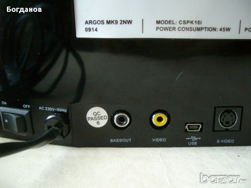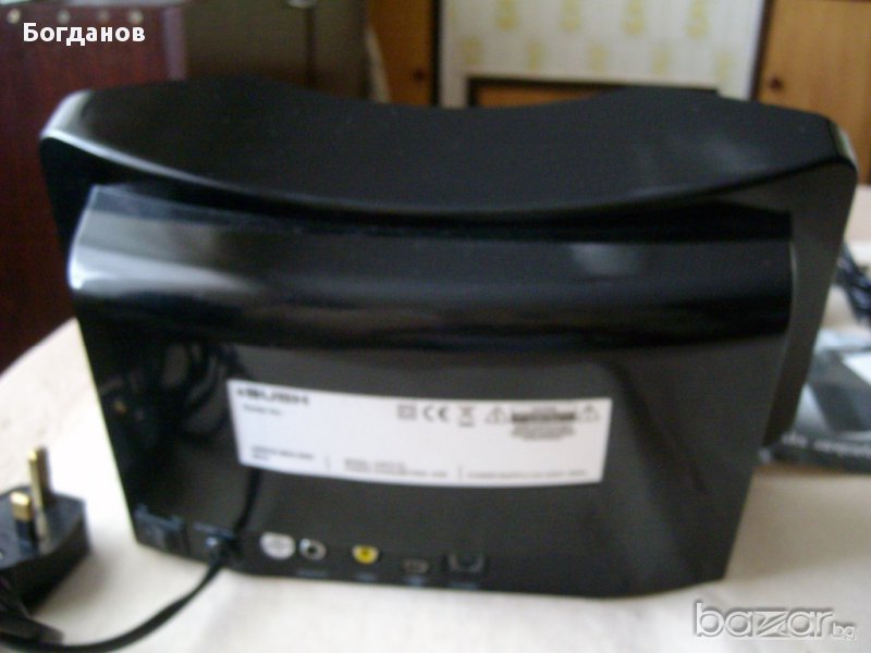 Устройството е Ново.Липсва само кутията.Кабелите и капачките за док станцията са в найлоните.Мощност 2х20 в.Работи на 220 в.Има BASS OUT,S VIDEO,AUX IN ,Размери ширина-30 см.,височина-17 см.,дълбочина горе-11 см. долу-15.6 см.