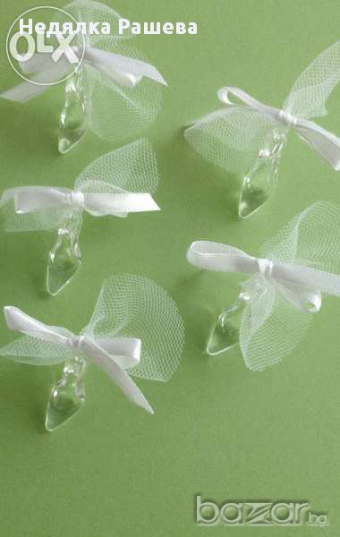 1. Сватбени Подаръчета пантофки от акрил , бели и лилави , с украса от сатен или органза . Цена за бр. - 0,6€ Всяко допълнение (надпис, перла, розички) плюс 0,05€
