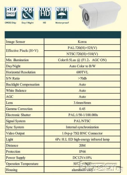 Видео изход: 1Vp-р, 75ohm , BNC конектор