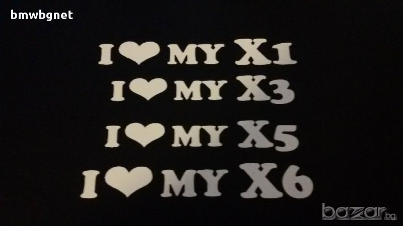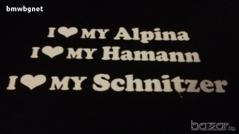 Стикери за Бмв "I love my BMW,E30,E36,E39,E46,E90,E91,E92,X1,X3,X5,X6,M,M1,M3,M5,M6,Hamann,Schnitzer,Alpina" за капак, колонките на вратите, стъкла и т.н.