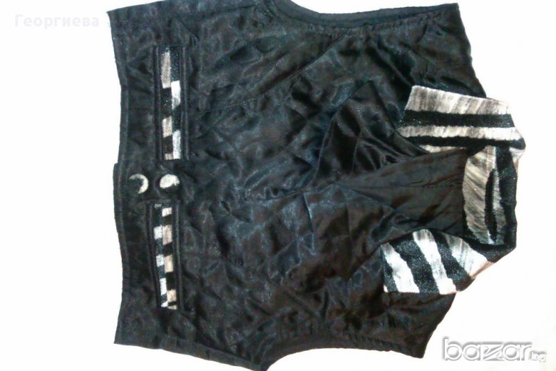 Костюма е уникален, поръчков модел, обличан е 2-3 пъти. Елечето е с размери: дължина 40 см., и широчина при подмишниците 38 см. Полата е с размери: дължина 37 см., и талия 62 см.
