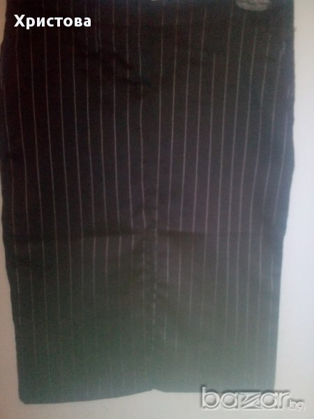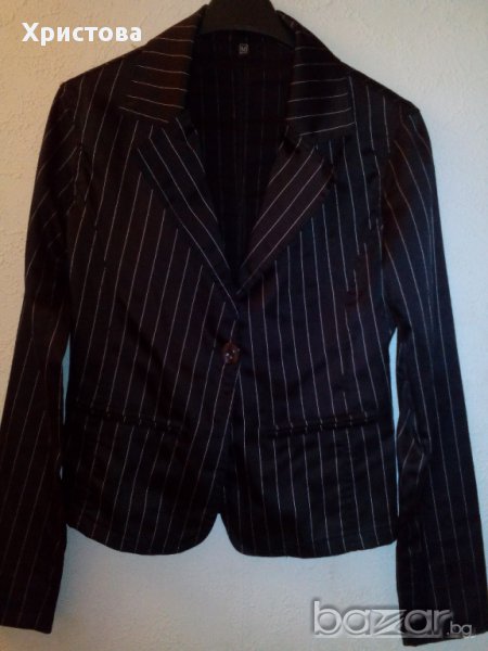 Черна сатенена къса права пола с една цепка отзад и тънко бяло райе в десена.Българска конфекция.Дължина 56 см,талия 74 см,ханш 84см.Без следи от носене.Черно сатенено сако в същото райе без подплата,с едно копче.Дължина 56см,талия 76см,бюст 90см,дължина ръкав 61 см.Размер S/M.