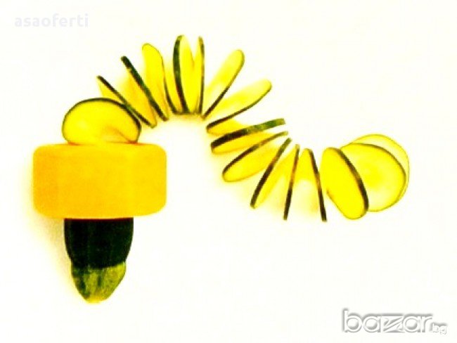 Le CHENG белачката се навива като винт около краставица, морков, банан, средно големи картоди и др. нарязвайки за секунди перфектни спирали.