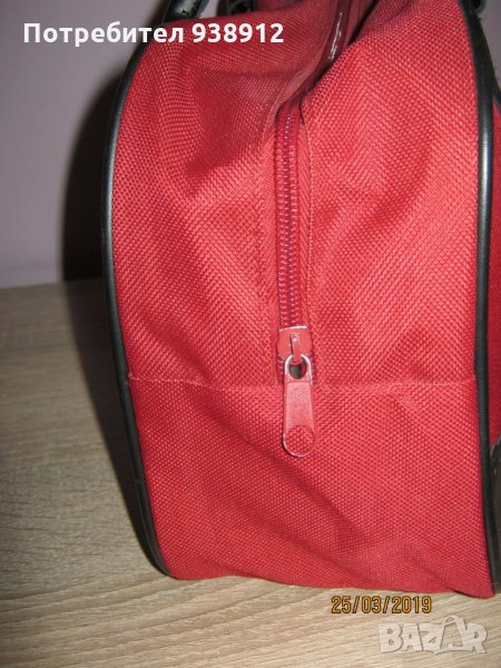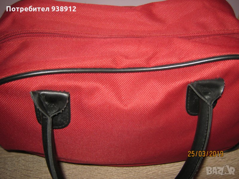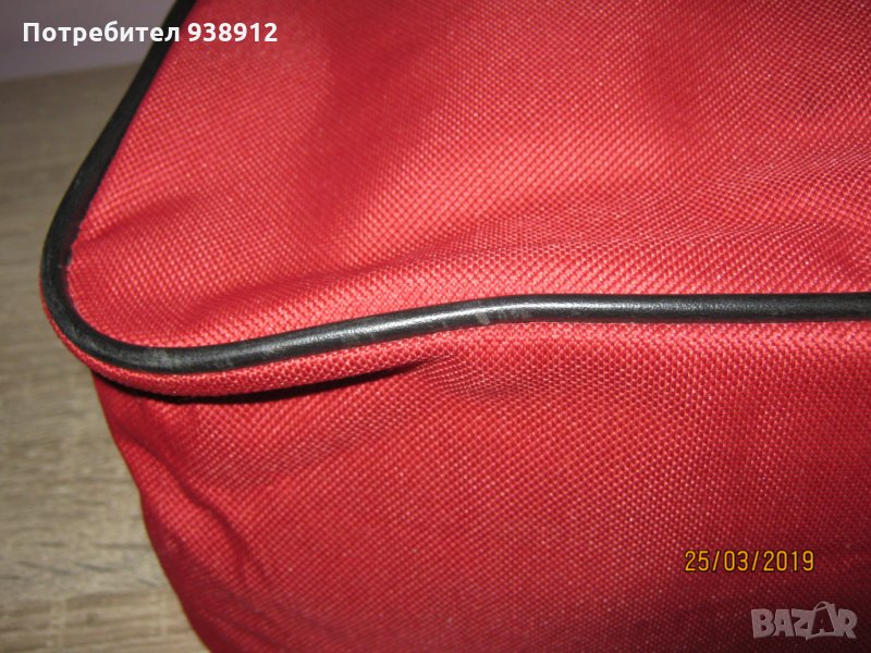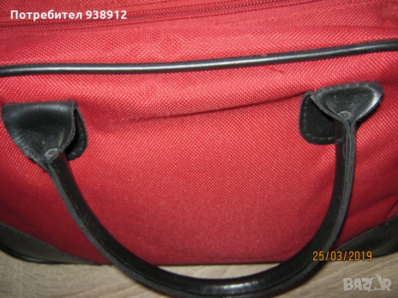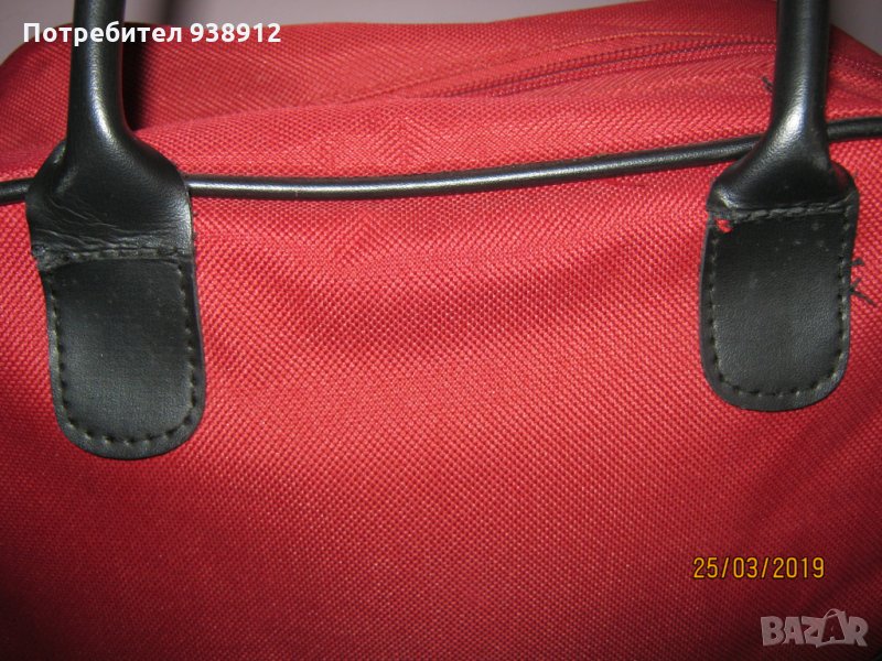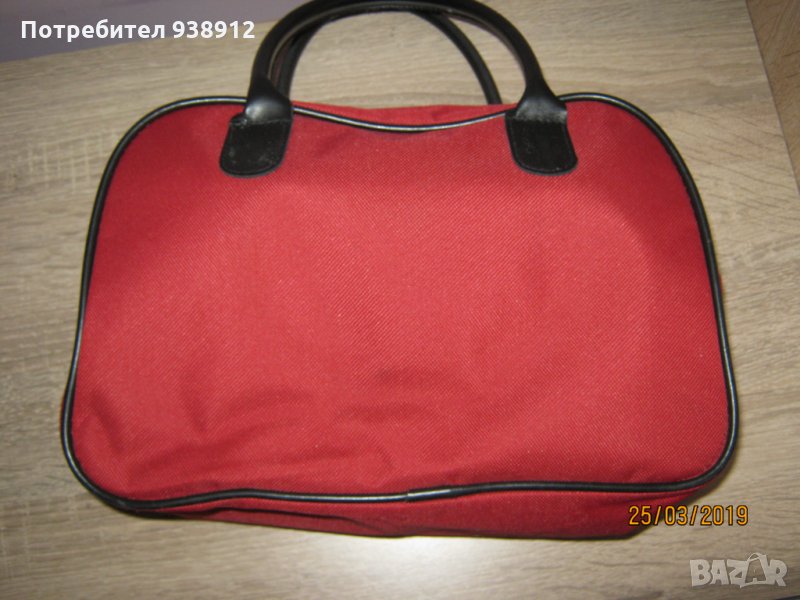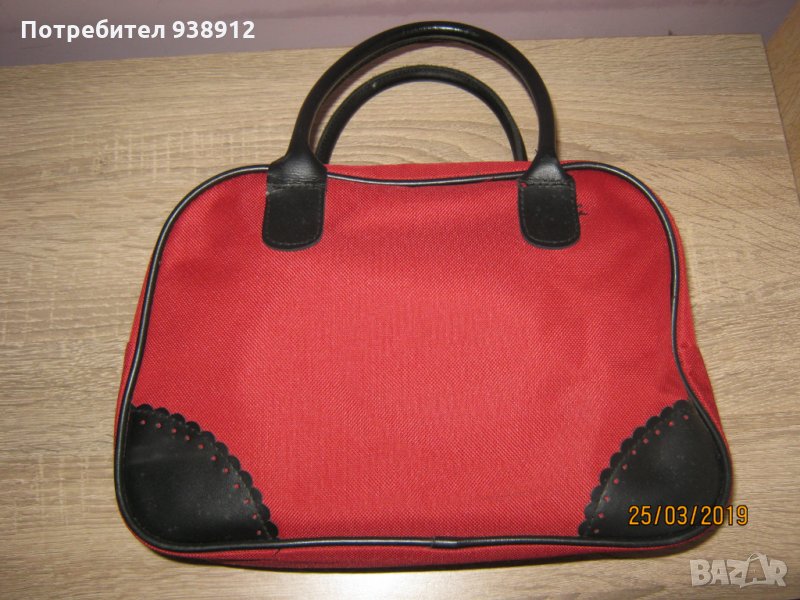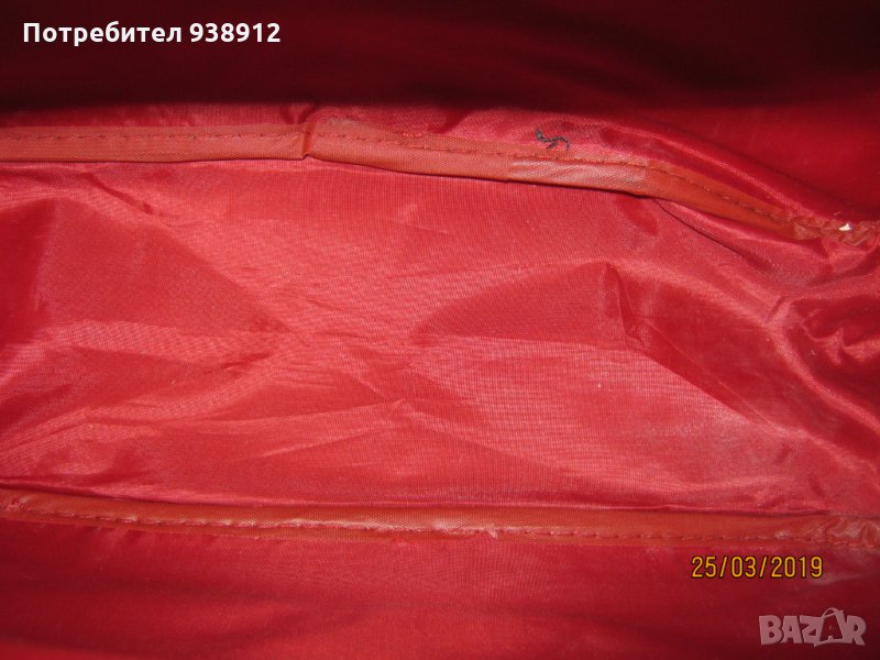 Чантата е запазена. Цветът е вишнево червен. Има леко износване по дръжките.
