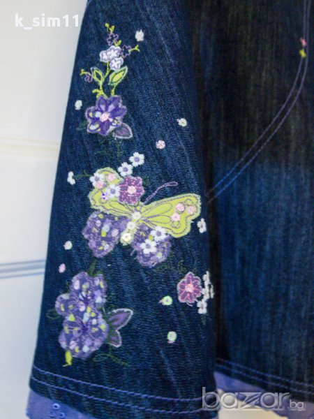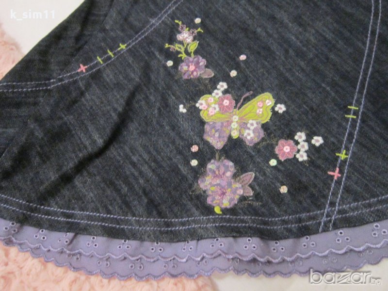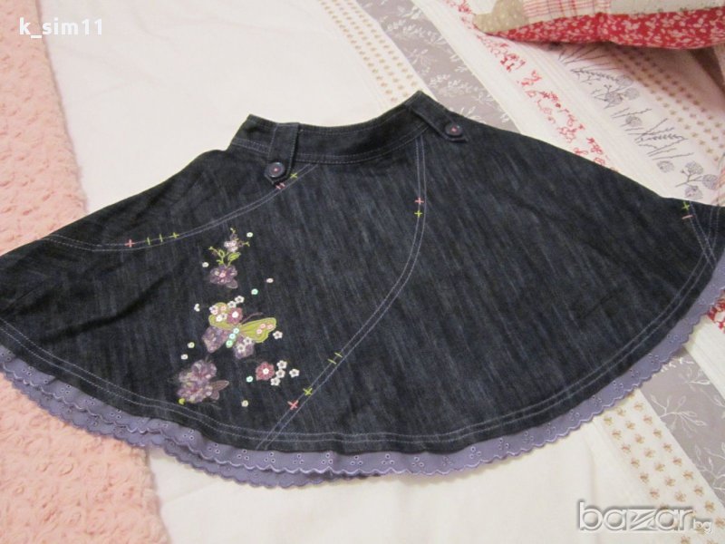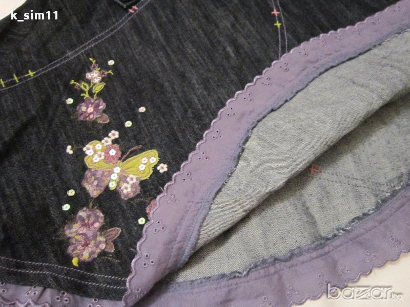 NEXT страхотна дънкова пола за 7 год. С бродерии, апликации на пеперуди и цветя, пайети, ластик за корекция на талията и лилиава дантела. Дънковия плат е много мек и прави полата удобна за носене. Красива и стилна в отлично състояние.