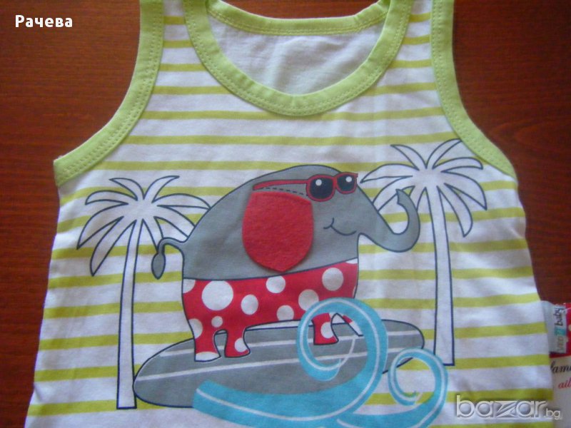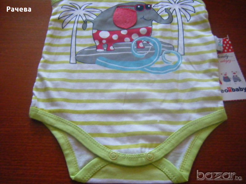 Зелено боди потниче със слонче.Състава е 100% памук.Размерите са 0-3месеца,3/6месеца.Всички размери са налични.Цената е за брой.