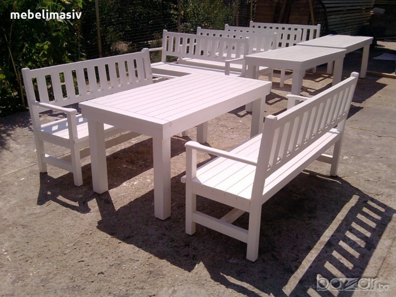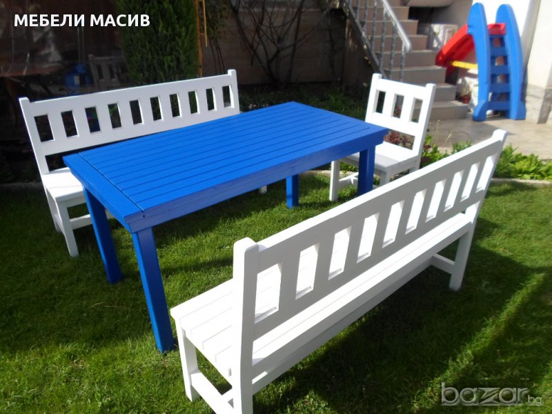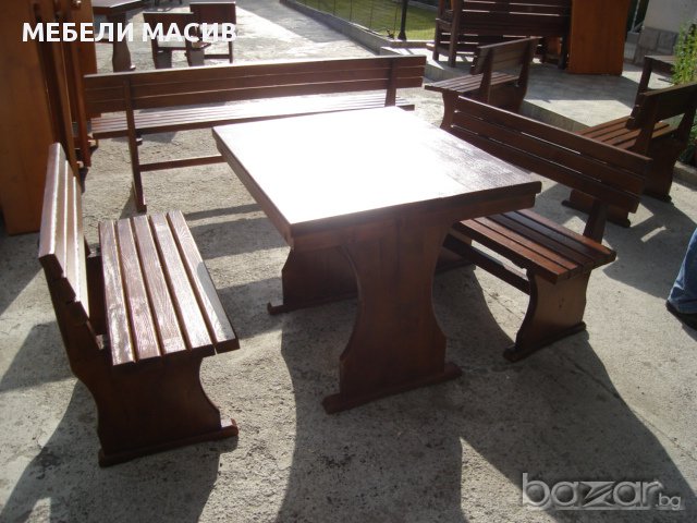 Изработваме маси и пейки за градината, балкона или заведението. Градинските маси и пейки се произвеждат от масивна дървесина и се лакират с екологично чисти лакове ,подходящи за външни условия.