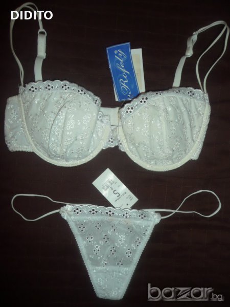 Комплекти от сутиен и прашки в бяло, различни размери. Цената на комплекта е 10лв., по отделно е 3,50лв./прашки и 6,50лв./сутиен. Налични размери С и М за прашките. Бельото е БГ производство.