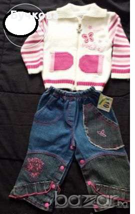 Лотът ни беше подарен точно така - жилетката с дънките - тази пролет. Но тогава ни беше голям, после се стопли и сега се оказа, че ни е вече малък. Така си остана неноесен, иначе се състои от много мекичка на допир нежна жилетка с цип и сладурски мадамски дънки, БГ-производство, с хубави флорални апликации и къдрички. Ако имате въпроси, не се колебайте да ги зададете на ЛС! Моля, ако имате време и желание, разгледайте и останалите ми предложения
