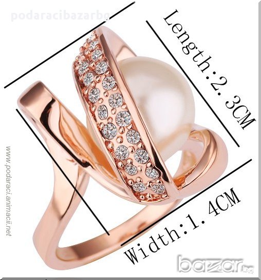 Артистичен пръстен с едра бяла перла в прегръдката на златно запълнена с розово злато спирала.Всъщност, не може да се каже, че е спирала, а доста по-сложен и интересен с извивките си елемент, който е инкрустиран с прозрачни бели кристали.Пръстенът се предлага в два размера – 7 и 8 по международен стандарт (халка № 7, обиколка: 54.00 мм; халка № 8, обиколка: 57.5 мм).Лесно можеш да установиш кой номер ще ти стои е добре.Вземи конец или хартиена лентичка, измери обиколката на пръста и после наложи на линийка.