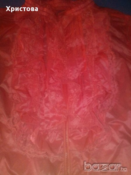 Яке от изкуствена,приятна на допир гладка изкуствена материя с ефектно жабо от дантела в същия цвят,пластмасов цип по цялата дължина отпред и широк ластик на талията и ръкавите.Дължина 54см,от мишница до долу 31см,дължина ръкав 59 см,от рамо до рамо 38 см,бюст 102 см,при ластик долу 80 см.Не е обличано.