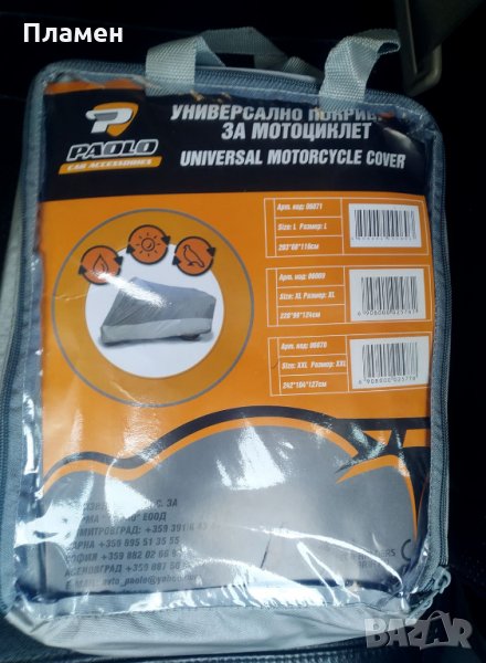 Допълнителна информация: ”Покривалата са чисто нови! С ватирана подплата! Универсално покривало за мотор. Предпазва както от влагата и водата, така и от слънчевите лъчи, които увреждат емайлака и предпазва от избеляване и повреждане на корпуса и боята на мотора. Водоустойчиво, Устойчиво против вятър, - Устойчиво на слънчева топлина; Предлага се в удобна за транспортиране и съхранение чантичка с цип. Система за сигурно покриване ПОКРИВАЛО ЗА МОТОЦИКЛЕТ ИЗРАБОТЕНО ОТ 180Т ДИШАЩ АНТИСТАТИЧЕН ПОЛИЕСТЕР, ОСИГОРЯВАЩ ДОБРА ЦИРКУЛАЦИЯ НА ВЪЗДУХ. С ДВОЙНИ БОД ШЕВОВЕ, ЕЛАСТИЧНО ДЪНО.. ПРЕДПАЗВА ОТ ДЪЖД, СНЯГ, ПРАХ И UV ЛЪЧИ.
