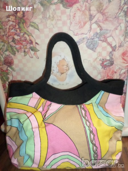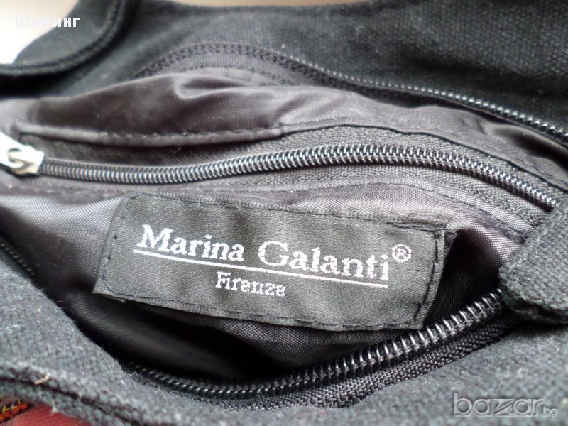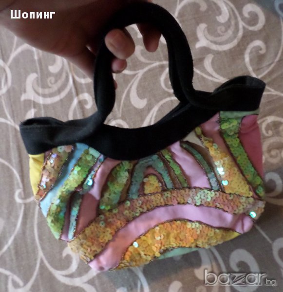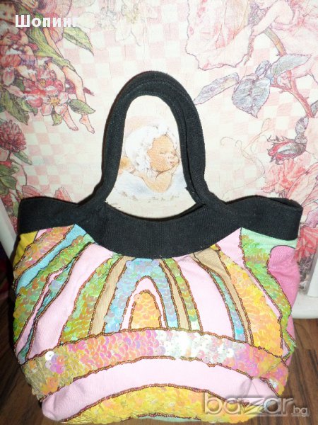 Много красива чанта -марка MARINA GALANTI, в свежи, пъстри, наситени цветове. Цялата предна част е с пайети, а задната само от плат. С различни шарки от двете страни. Материал - памук. Размери: дължина 28 см, височина 20 см, дълбочина 10 см. Два малки вътрешни джоба, единият с цип, без преграда. Основно закопчаване - с облечен цип.
