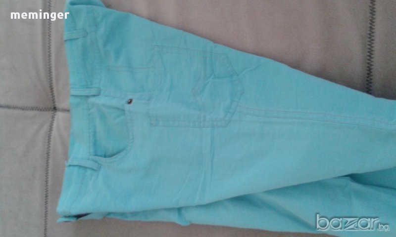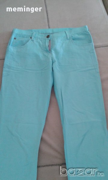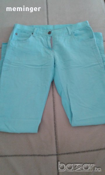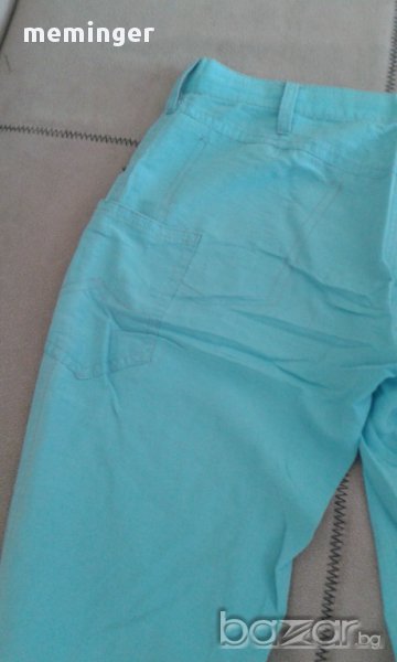 Панталона е точно за лятото, много тънък и държи прохладно. Цвета му е син, размерите му са талия 37/ниска/, ханш 47, дължина 95см. Запазен е, няма скъсано.