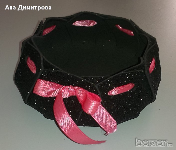 Ръчно изработена кошничка от фоам и панделка от сатен или органза. Диаметър в горната и част - приблизително 10-12 см., височина - 5 см.