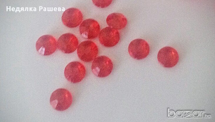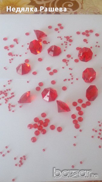 Три размера изкуствени диаманти в червено. Диаманти 3 см - 0.40 лв за брой Диаманти 1 см -200 бр -7 лв Диаманти 4,5 мм - 500 бр -7 лв Комплект от 20 бр(3 см),200 бр(1 см) и 500 бр(4,5 мм) -20 лв.