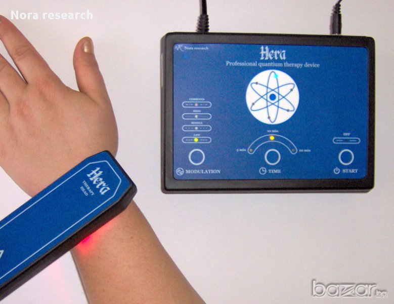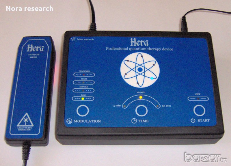 Професионалният електронен апарат “Hera” (Хера) е ново поколение уред и е предназначен за извършване на квантова терапия върху човешкия организъм. Въздействието е върху биологически активните зони и органи в човешкото тяло , чрез електромагнитно излъчване в определен диапазон. По този начин стимулира собствените жизнени сили за борба с голям брой заболявания, подобрява кръвообращението, активизира имунната система на организма и оказва противовъзпалително и обезболяващо действие. С негова помощ се извършва безлекарствено и безболезнено лечение на широк спектър от заболявания. При приемане на медикаменти, терапията с апарата повишава в пъти тяхната ефективност. Спомага и за ефективното лечение на труднолечимите артрити и ставни заболявания. Благодарение на новите технологии и елементна база стана възможно да разполагате в дома си с апарат предлагащ терапия , която до скоро само клиниките предлагаха. Предвидени са 4 програми за терапия, както и 3 автоматични интервала за продължителност на терапията. Пускането и работата с апарата са максимално улеснени и се извършват с натискането на квазисензорни бутони. Предвидени са звукови и светлинни индикатори. Апарата притежава високи технически параметри съчетани с максимално улеснено използване, което позволява да бъде прилаган от всякакви медицински специалисти в тяхната практика, а също така и за самостоятелна ежедневна употреба. Спада към ниския ценови диапазон апарати за Квантова терапия, но като възможности не отстъпва на тези от високия . Произведен е и проектиран изцяло в Европейският съюз.