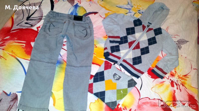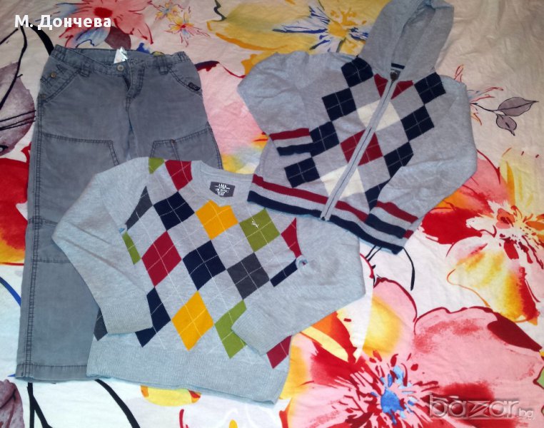 Лота включва жилетка и пуловер в отлично състояние и подарък панталон със забележка - скъсан на коляното.