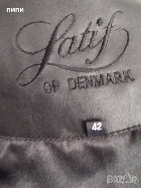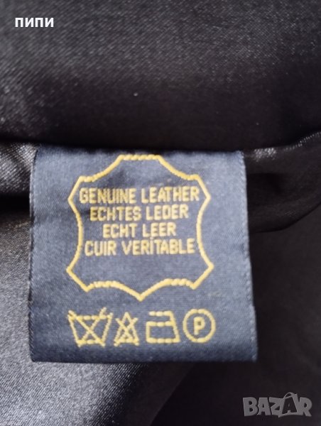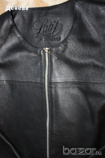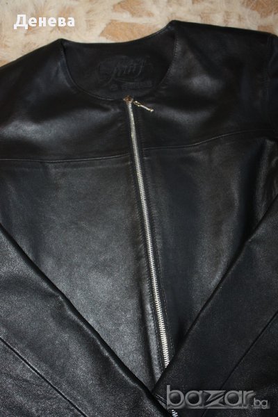 Дамско черно сако от естествена кожа със следните мерки в сантиметри - гръб - 44см., дължина на ръкав - 64см., дължина от тила до долу - 61см., гръдна обиколка - 100см.