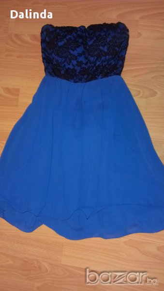 Свежа ефирна ролкя тип бюстие в красив син цвят.Роклята е подходяща за всякакви поводи,може да се каже че размерът й е универсален защото горната част има еластичност,а долната е разкроена.Обличана е точно два пъти.