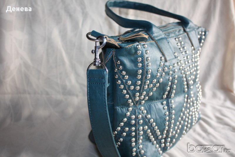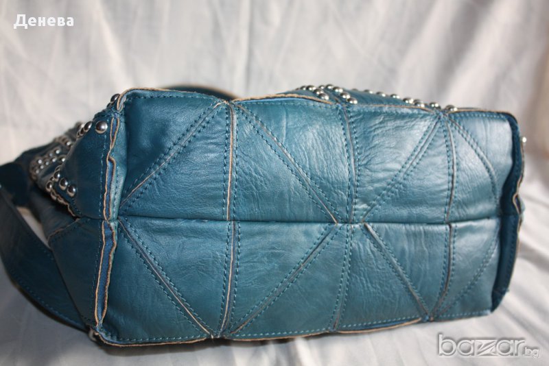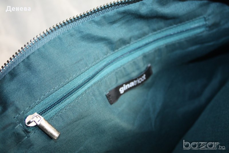Дамска чанта на GINA TRICOT от 100% естествена кожа в красив петроленосин цвят с метални орнаменти, с две къси и една дълга дръжка, с една вътрешна преграда и три вътрешни джоба, от които едниния се закопчава с цип. Ширина на чантата - 38см, височина - 25 см. Дългата дръжка може да се регулира. Чантата е нова, без забележки. Не разменям!
