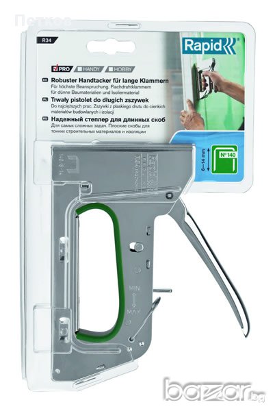 1. Rapid R34 приляга удобно в ръката и няма откат, което го прави лесен за използване за дълги периоди, ако е необходимо. Той разполага с регулировка на силата на удара - за твърди или меки материали. Препоръчва се за използване в тапицерски работилници, тавани, плочи, изолационни материали, пластмасови листи, монтаж, килими, и т.н.
