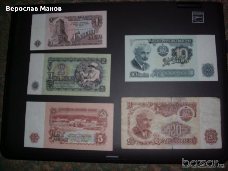 Комплект от български банкноти от 1974 година. В идеално състояние са само купюрите от 1 и 5 лева. Двайсетачката вече е продадена. Има и още банкноти от същата година, някои са с поредни номера.