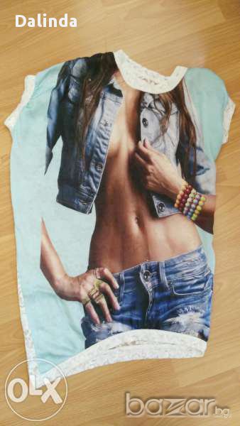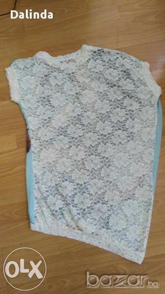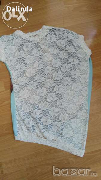 Дамска широка туника с паднало рамо и изцяло дантелен гръб.Материята отпред е много финна нещо между коприна и сатен,а отзад е дантела и е много проветриво в големите жеги.Стои страхотно с клин,с къси панталони с полички и дънки.Много интересен и практичен модел,универсален размер,нова.