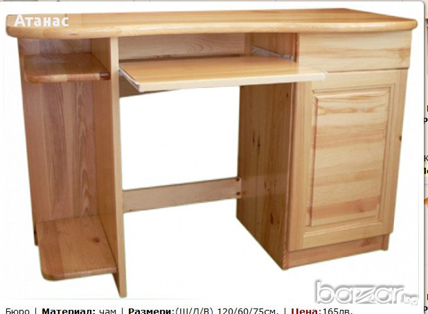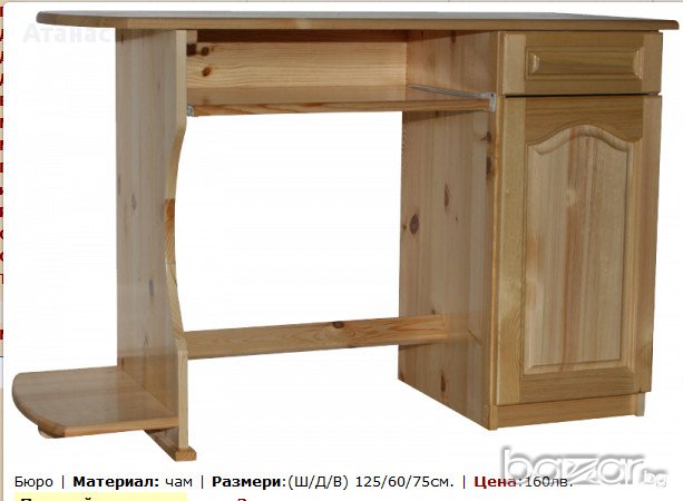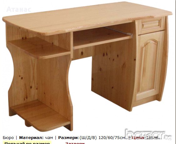 Предлагам изработването на бюра за Настолни компютри. Направени от дървесина бял бор и лакирани с 2-ву компунентни лакове на италианската фирма Сирка. Размерите на самото бюро се задават от клиента и от там произлиза цента. Цената в обявата е примерна.