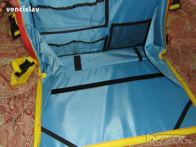 Чанта за училище,подходяща за учебни помагала,както и за лаптоп.Може да се носи и на гърба,има и дръжка за ръката,модела е унисекс в интересни цветове от синьо,червено и жълто.Размери-40 на 30см.,Нова,без етикет