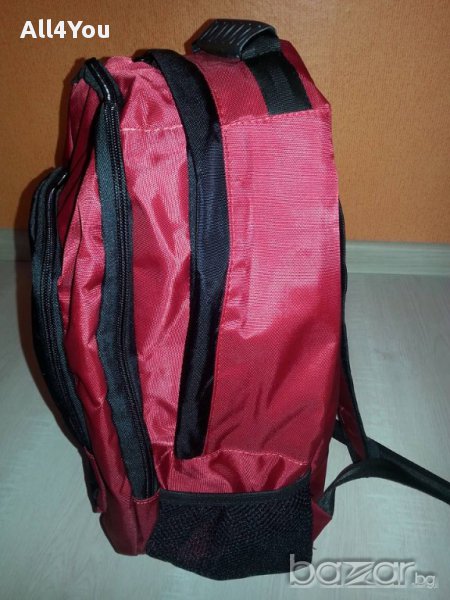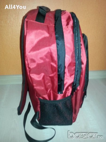 Голяма нова ученическа раница- червено и черно. С три прегради с цип и два странични джоба. В предната преграда има отделения-органайзери. С регулируеми презрамки. Размерите са 44х34х15см. Надписът е найлонов и може да се махне без да остане следа!