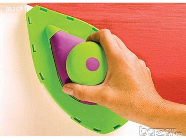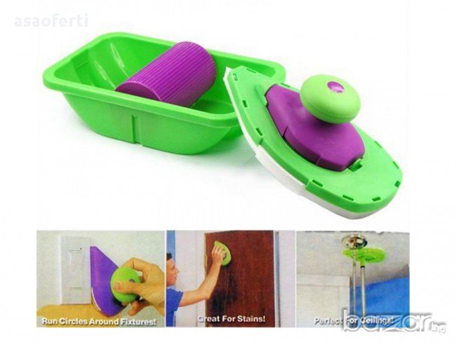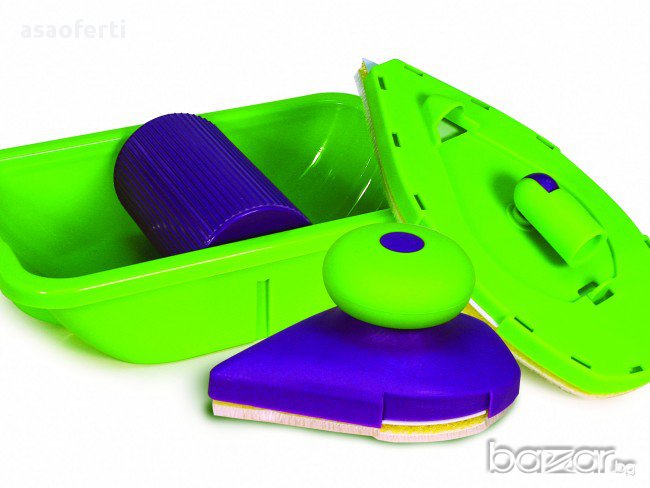 бояджия. Комплектът е съставен от 2 "валяка" - дунапренени четки с форма на ютия, които много удобно боядисват постранството до ъгъл без помощта на тиксо и помощни материали. ПРОСТО ОТСИЧАТ без да внимавате, без опастност от теч, подливане или изцапване на тавана. Двете "четки" поемат нужното количество боя от специално констроираната роторна ваничка, която разпределя перфектно съдържанието и количеството боя по четката. Голямата "четка" има чупещо във всички посоки рамо за завиване на удължител (не включен в комплекта).