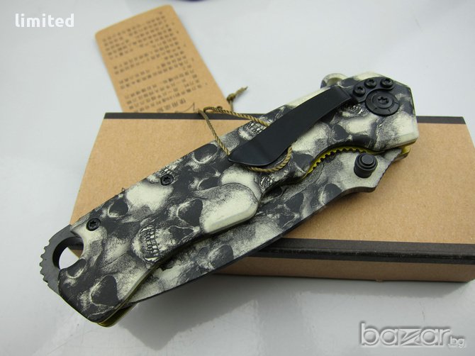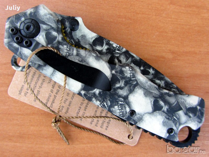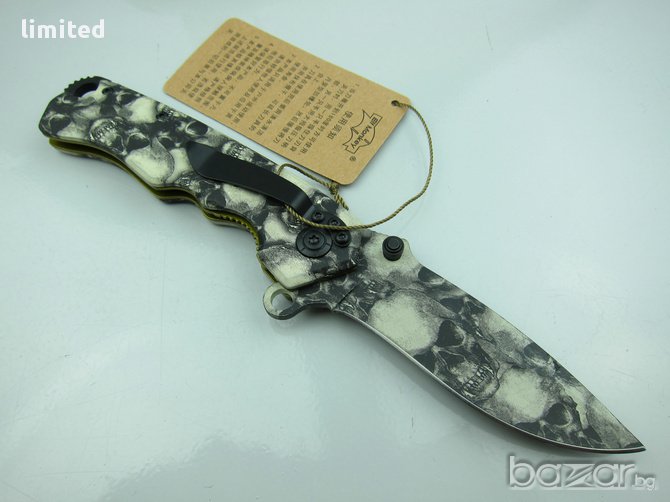 Много добър и здрав сгъваем нож. Дръжката е от металносребриста стомана.Ножа е снабден с подпружинен механизъм,пластина за блокиране на острието в отворено положение, резервен щифт за отваряне с дясна или лява ръка.Ръкохватката е много качествено изработена и се отличава с ергономичност и стабилност даваща много добър захват.