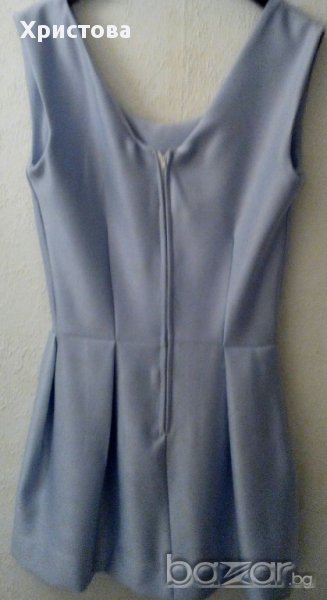 Къса светло сива рокля със сребрист отблясък(изкуствена немачкаема материя,наподобяваща фино гладко кадифе) без ръкави,рязана в талията,с плохи в долната част.Дължина 81см(от рамо до талия 44см),талия 66см,бюст 86см.Закопчава се с цип(38см) на гърба. Не е обличана.