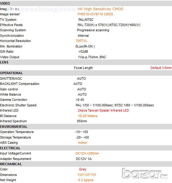 Минимална осветеност: 0 Lux с IR ON (при включени инфрачервени LED диоди), F=1.2