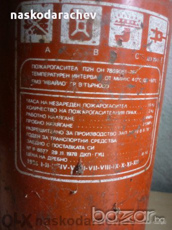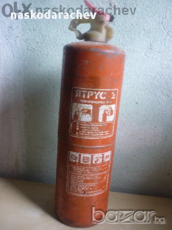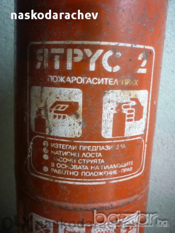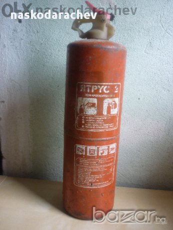 Прахов пожарогасител Янтрус 2, български, зареден, готов за употреба, височина на бутилката 31 см, диаметър 10 см, цена - 25 лв.