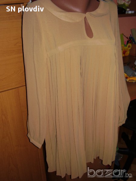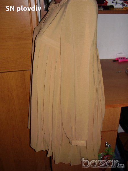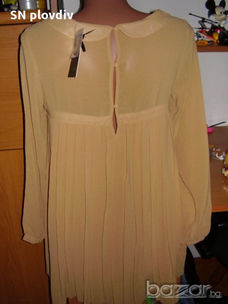 дължина-81см,мерена от рамото,ширината под мишниците-48см. Отзад роклята се закопчава с 3 копченца.Цялата е ефирна ,с подплата.Цвят-camel ,