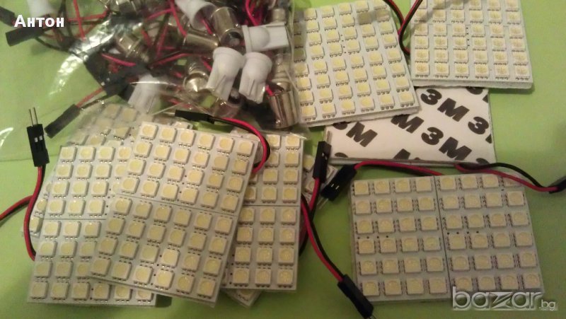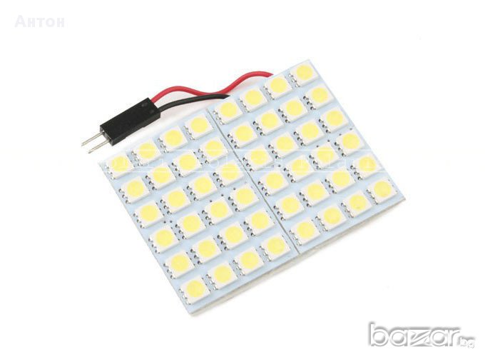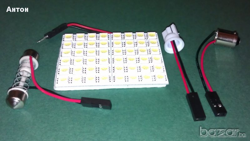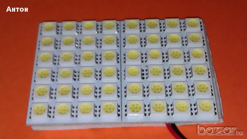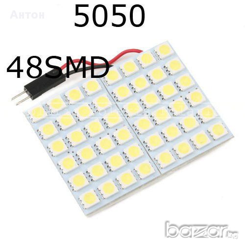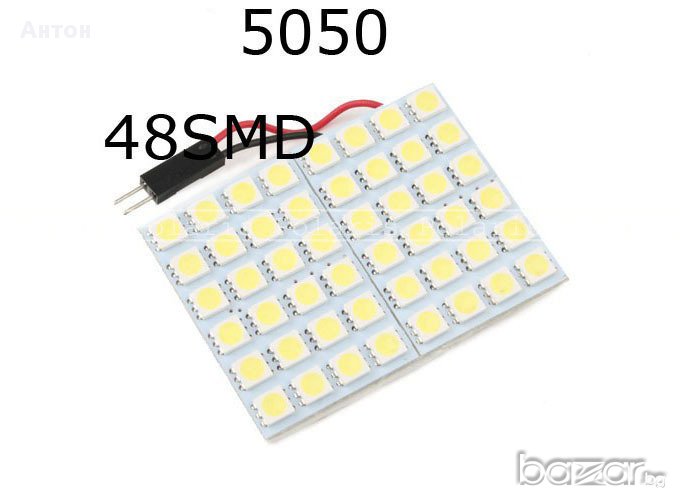 Супер мощна 12 волта ЛЕД плочка - 6 х 8 диода тип 5050. Има накрайници за T10 и други типове фасонки за по-лесно монтиране, показани са на снимката.