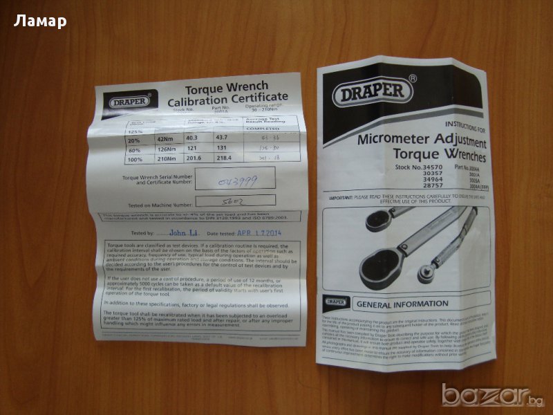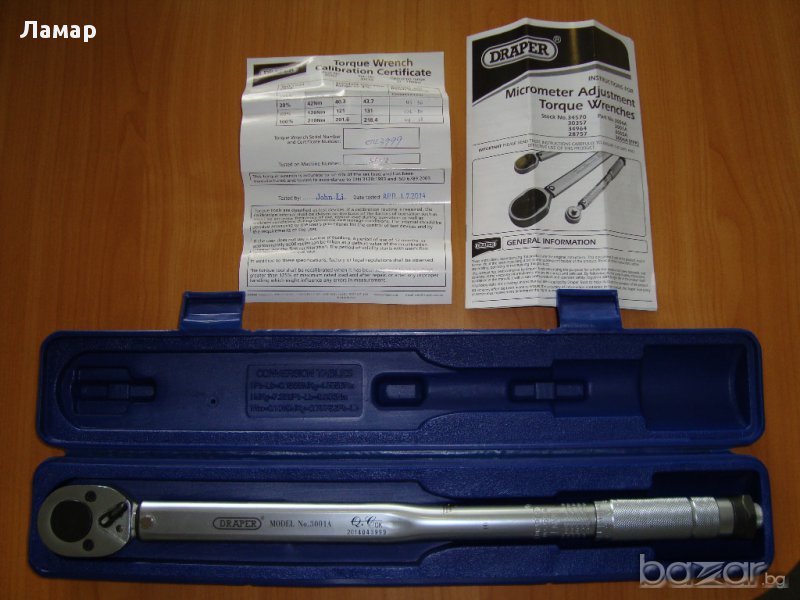 Динамо метричен ключ 30-210Nm точност 4 процента.Ключа работи изключително точно и издържливо във времето.Придружен от сертификати за точността издадени от производителя DRAPER